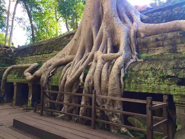 「早起きは三文の得!」アンコールワットで刻々変わってくる朝焼けと幻想的な朝日鑑賞。一旦ホテルに戻って朝食と休憩。その後アンコールトムへ再出発。アンコールトムの南大門とその内にある微笑みの顔が沢山彫ってあるバイヨン、200メートルもある空中の参道と巨大な涅槃像で有名なバプーオン、かつての王宮の前にそび立つピミアナカス遺跡、王宮広場の象のテラスなどと「トゥームレイダー」という映画の撮影スポットにもなった密林に埋もれたままのタプローム遺跡をご見学。昼食の後に引き続きにアンコールワットへ。第一回廊のレリーフ、十字回廊、第二回廊、第三回廊などをゆっくりご見学。
