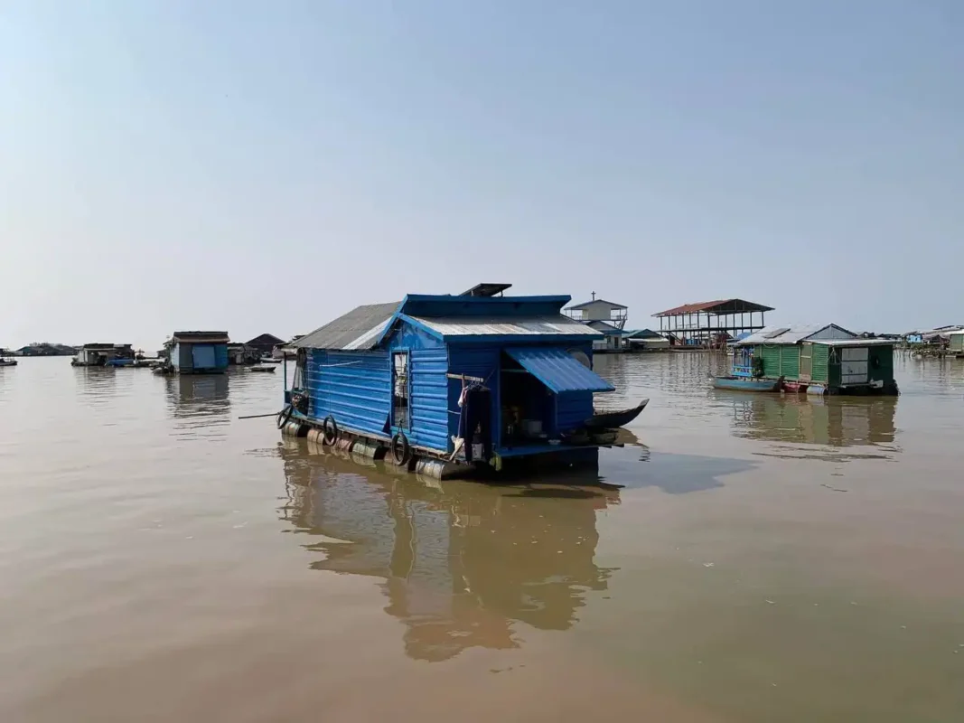 トンレサップ湖へ向かう川沿いには、高い柱の上に建てられた高床式の民家がずらりと並びます。雨季には水位が床のすぐ下まで上がり、家々がまるで水に浮かんでいるような幻想的な景色になります。一方、乾季には長い柱がはっきりと見え、この地域ならではの独特な風景を楽しむことができます。